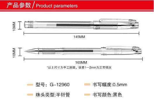 商品名称:金万年 G-12960 秒干棱杆0.5半针管配RS07芯拔帽中性笔-黑色 (计价单位:支)