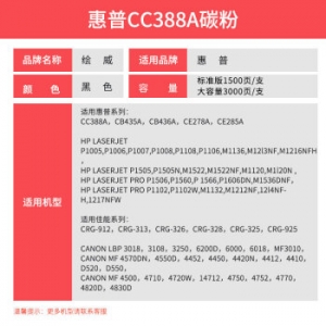 - 商品名称:绘威CC388A(1500页)碳粉 适用惠普HP P1007 P1008 P1106 P1108 M126a nw M1136 M1213nf M1216nfh墨粉