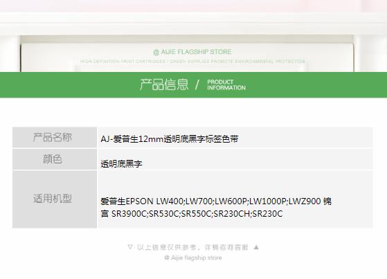 商品名称:艾洁 爱普生 12mm透明底黑字标签色带 适用EPSON LW300;LW400;LW700;LW600P;LW1000P LK-4TBW