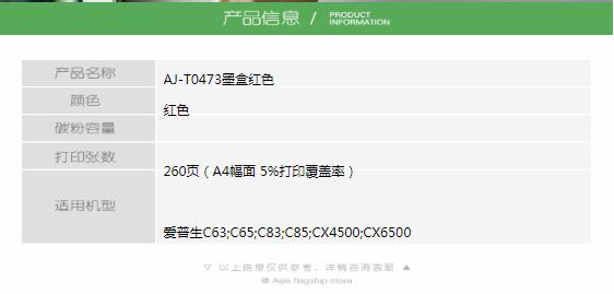 商品名称:艾洁 T0473 墨盒红色 适用爱普生EPSON C63 C65 CX3500打印机CX6500墨盒T0461