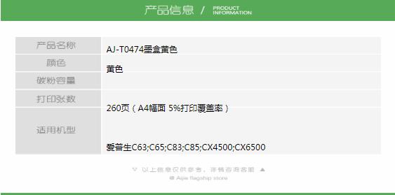 商品名称:艾洁 T0474 墨盒黄色 适用爱普生EPSON C63 C65 CX3500打印机CX6500墨盒T0461
