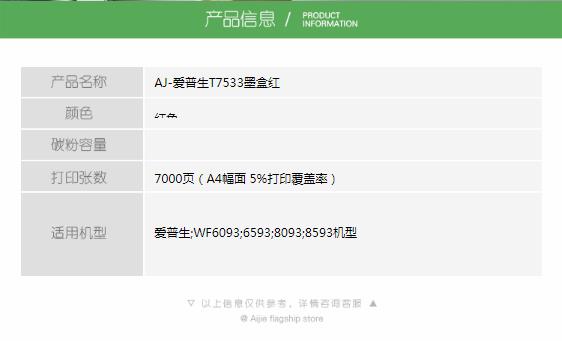 商品名称:艾洁 爱普生 T7533 墨盒红色 适用WF6093 6593 8093 WF8593打印机墨盒