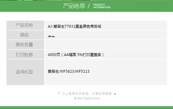 商品名称:艾洁 爱普生 T7931 墨盒黑色商务版 适用WF5113 5623 5693机型