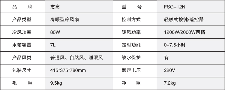商品名称:志高(chigo) FSG-12N 冷暖遥控型驱蚊冷风扇