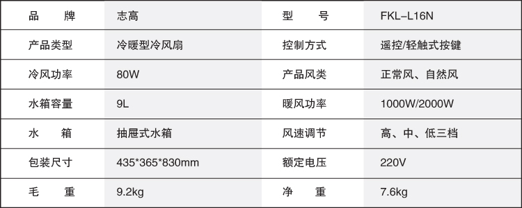 商品名称:志高(chigo) FKL-L16N 冷暖遥控式冷风扇