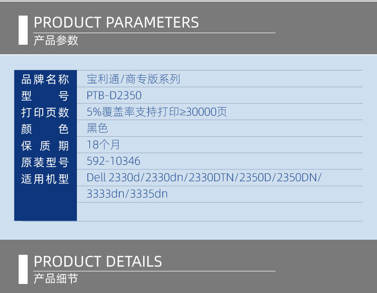 - 商品名称:宝利通(商专版系列)PTB-D2350 硒鼓 适用Dell 2330d/2330dn/2330DTN/2350D/2350DN/3333dn/3335dn