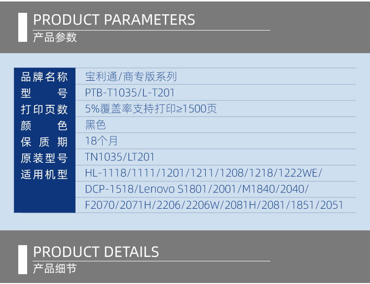 - 商品名称:宝利通(商专版系列)PTB-T1035/L-T201 硒鼓 适用HL-1118/1111/1201/1211/1208/1218/1222WE/DCP-1518/Lenovo S1801/2001/M1840/2040/F2070/2071H/2206/2206W/2081H/2081/1851/2051