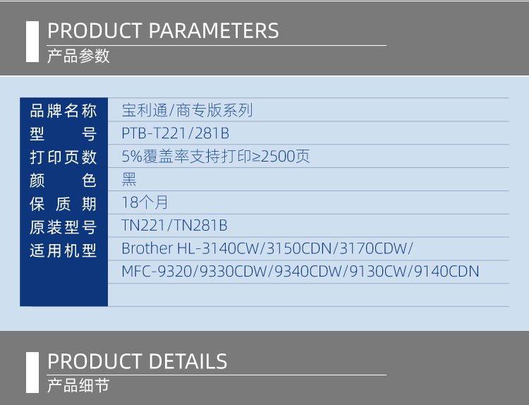 - 商品名称:宝利通(商专版系列)PTB-T221/281B 硒鼓 适用BrotherHL-3140CW/3150CDN/3170CDW/MFC9320/9330CDW/9340CDW/9130CW/9140CDN