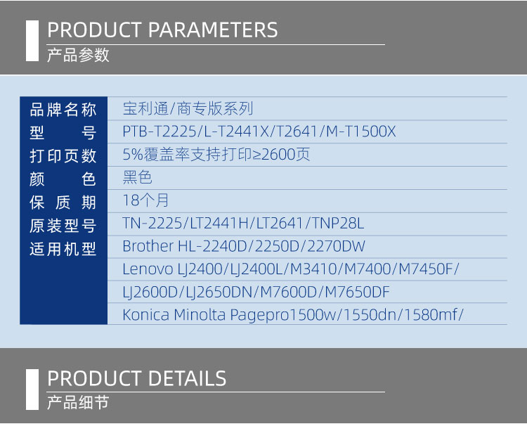 - 商品名称:宝利通(商专版系列)PTB-T2225/L-T2441X/T2641/M-T1500X 硒鼓 适用Brother HL-2240D/2250D/2270DW Lenovo LJ2400/LJ2400L/M3410/M7400/M7450F/LJ2600D/LJ2650DN/M7600D/M7650DF Konica Minolta Pagepro1500w/1550dn/1580mf/