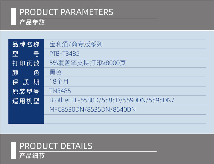 - 商品名称:宝利通(商专版系列)PTB-T3485 硒鼓 适用BrotherHL-5580D/5585D/5590DN/5595DN/MFC8530DN/8535DN/8540DN