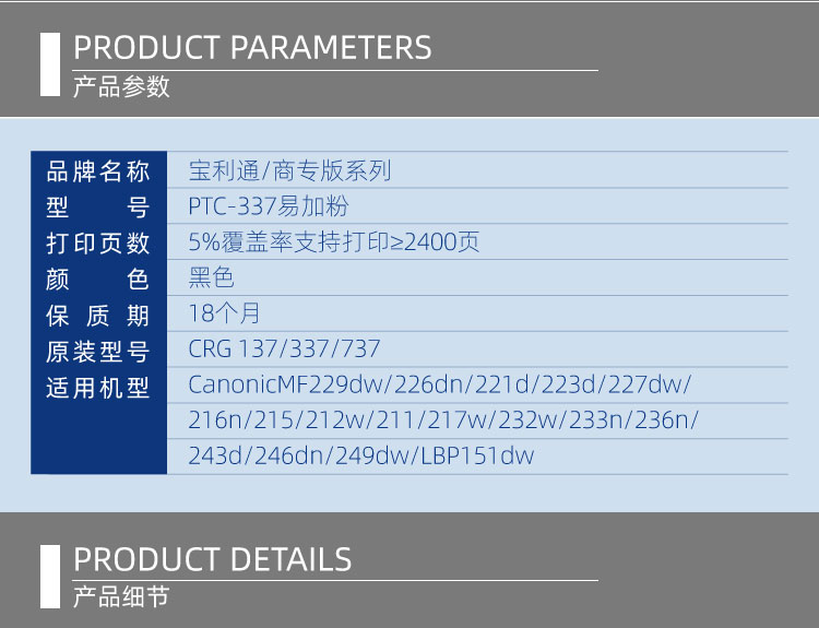 - 商品名称:宝利通(商专版系列)PTC-337易加粉 硒鼓 适用CanonicMF229dw/226dn/221d/223d/227dw/216n/215/212w/211/217w/232w/233n/236n/243d/246dn/249dw/LBP151dw