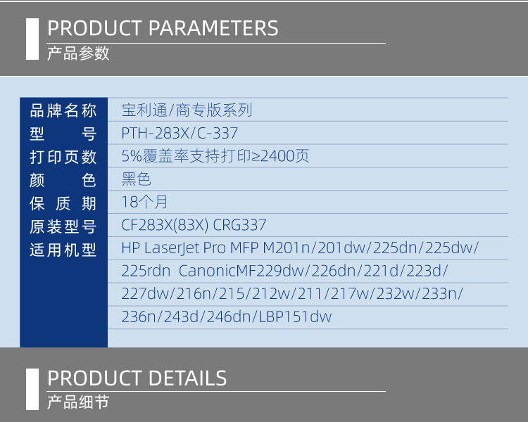 - 商品名称:宝利通(商专版系列)PTH-283X/C-337 硒鼓 适用HP LaserJet Pro MFP M201n/201dw/225dn/225dw/225rdn CanonicMF229dw/226dn/221d/223d/227dw/216n/215/212w/211/217w/232w/233n/236n/243d/246dn/LBP151dw