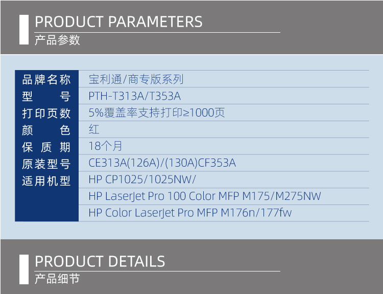 - 商品名称:宝利通(商专版系列)PTH-313A/T353A 硒鼓 适用HP CP1025/1025NW/HP LaserJet Pro 100 Color MFP M175/M275NW/HP Color LaserJet Pro MFP M176n/177fw