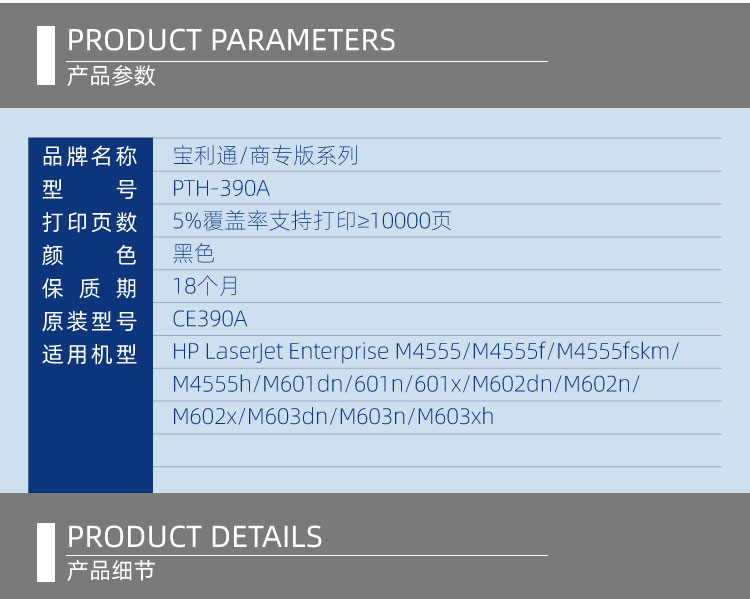 - 商品名称:宝利通(商专版系列)PTH-390A 硒鼓 适用HP LaserJet Enterprise M4555/M4555f/M4555fskm /M4555h/M601dn/601n/601x/M602dn/M6 02n/M602x/M603dn/M603n/M603xh