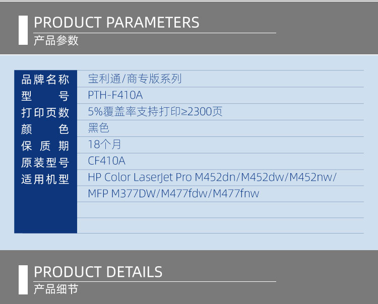 - 商品名称:宝利通(商专版系列)PTH-F410A 硒鼓 适用HP Color LaserJet Pro M452dn/M452dw/M452nw/MFP M377DW/M477fdw/M477fnw