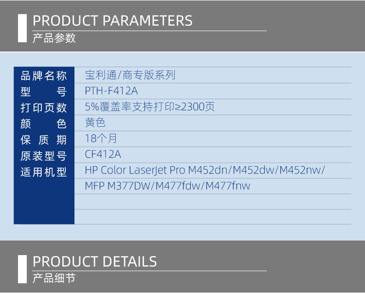 - 商品名称:宝利通(商专版系列)PTH-F412A 硒鼓 适用HP Color LaserJet Pro M452dn/M452dw/M452nw/MFP M377DW/M477fdw/M477fnw