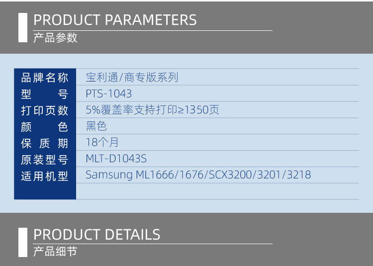 - 商品名称:宝利通(商专版系列)PTS-1043 硒鼓 适用Samsung ML1666/1676/SCX3200/3201/3218