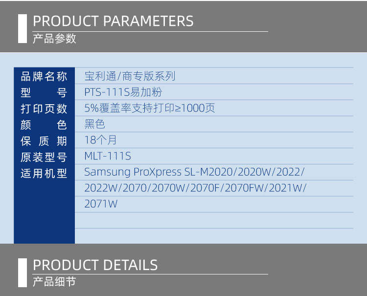 - 商品名称:宝利通(商专版系列)PTS-111S易加粉 硒鼓 适用Samsung ProXpress SL-M2020/2020W/2022/2022W/2070/2070W/2070F/2070FW/2021W/2071W