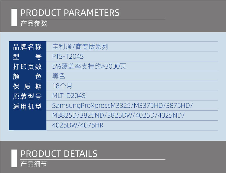 - 商品名称:宝利通(商专版系列)PTS-T204S 硒鼓 适用SamsungProXpressM3325/M3375HD/3875HD/M3825D/3825ND/3825DW/4025D/4025ND/4025DW/4075HR