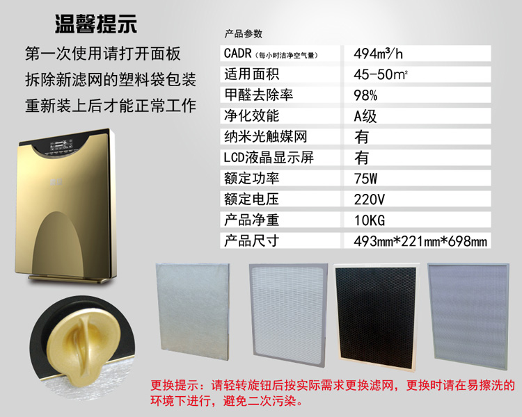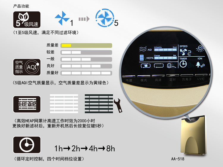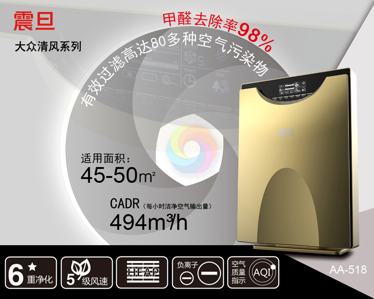 商品名称:震旦(AURORA)AA-518 金色空气净化器 有效过滤80多种空气污染物,清新负离子、除PM2.5、去甲醛、异味