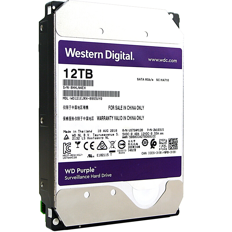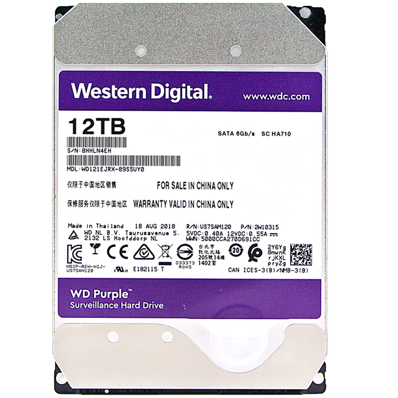 西部数据(WD)紫盘 12TB SATA6Gb/s 256M 监控硬盘(WD121EJRX)