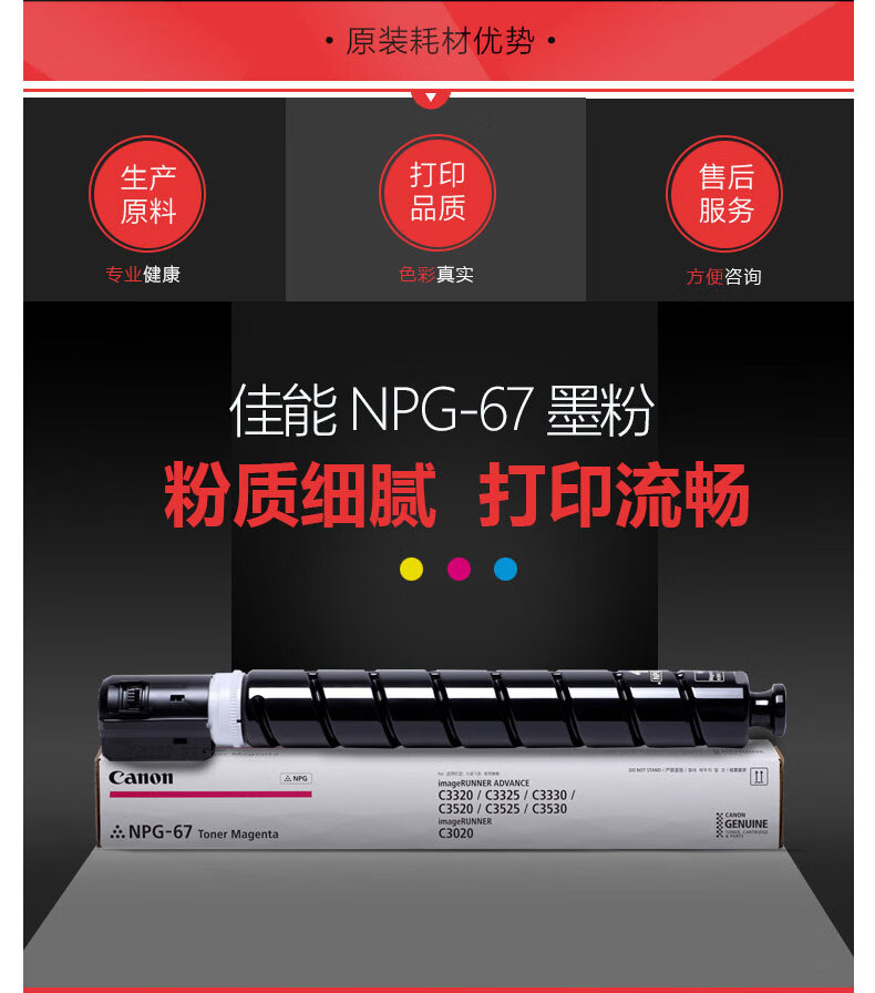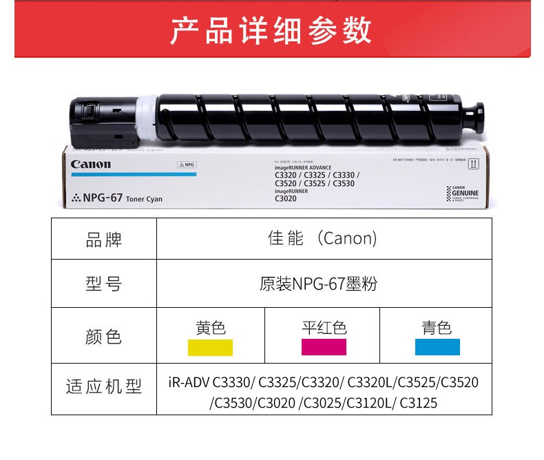 - 商品名称:佳能NPG-67墨粉盒/感光鼓(适用C3020/3025/3520/3325/3530/3120L) NPG-67M 红色碳粉(经济装2500页)