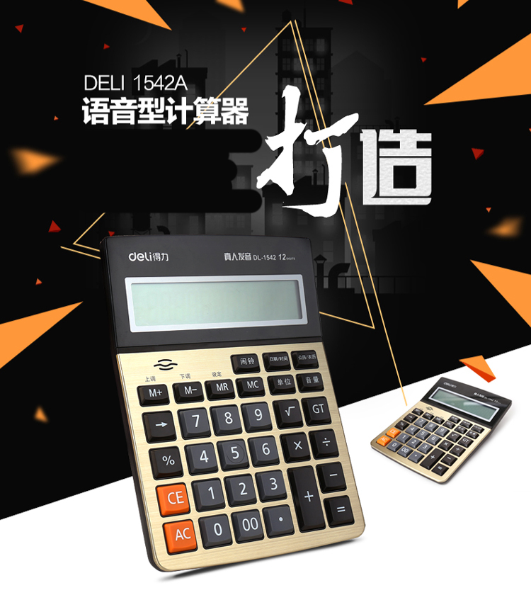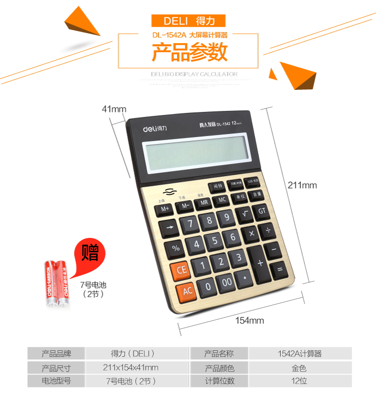 商品名称:得力(deli)1542A 大屏幕12位语音型计算器 金色 211*154*41mm