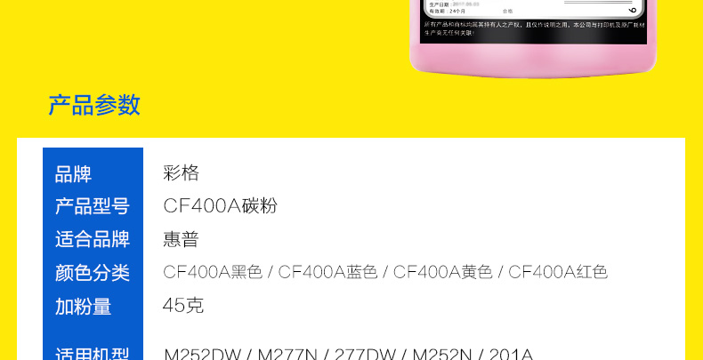 - 商品名称:彩格CF400A碳粉四色套装(适用惠普HP CF500A CF510A CF410A CF400A 佳能CRG045 CRG054打印机墨粉)