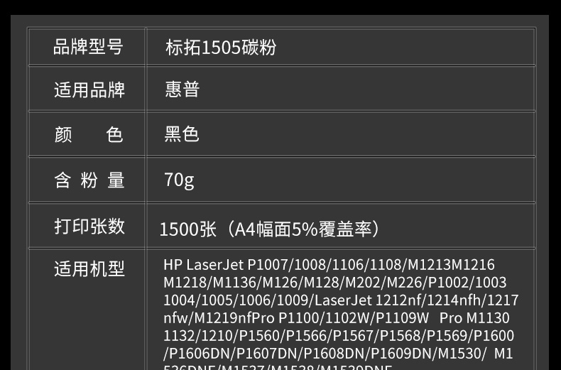- 商品名称:标拓 388a硒鼓1505碳粉/墨粉(适用惠普 P1007/P1008/P1106/P1108/M1136/M1213nf)