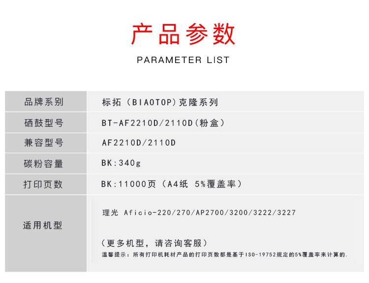 - 商品名称:标拓 AF2210D/2110D墨粉筒适用理光Aficio-220 270 AP2700 3200 3222 3227复印机 克隆系列
