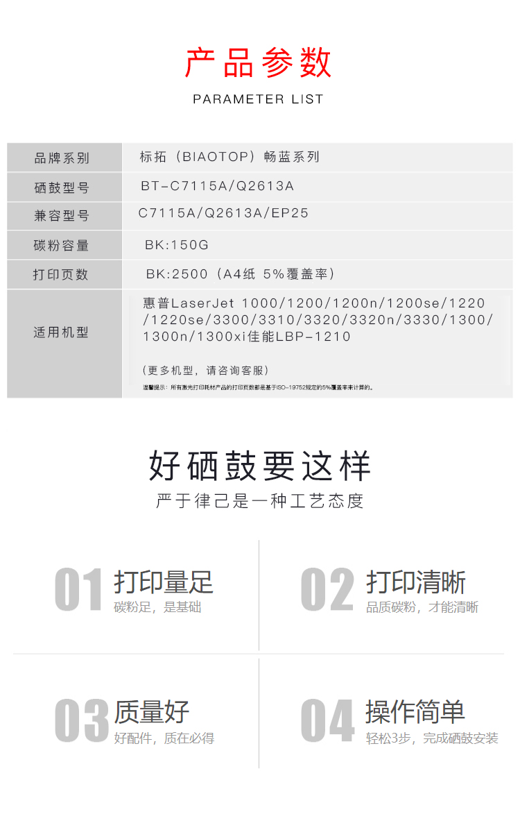 - 商品名称:标拓 C7115A/Q2613A硒鼓适用惠普1000/1200/1220/1220se打印机 畅蓝系列