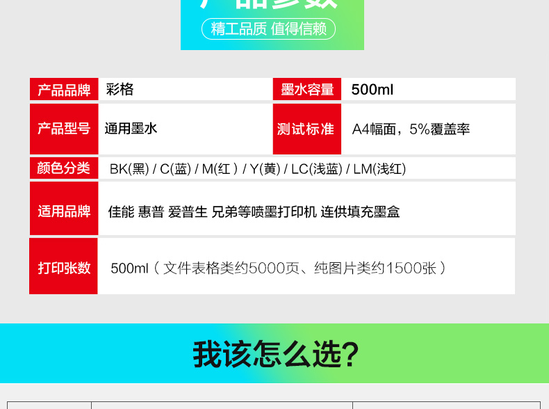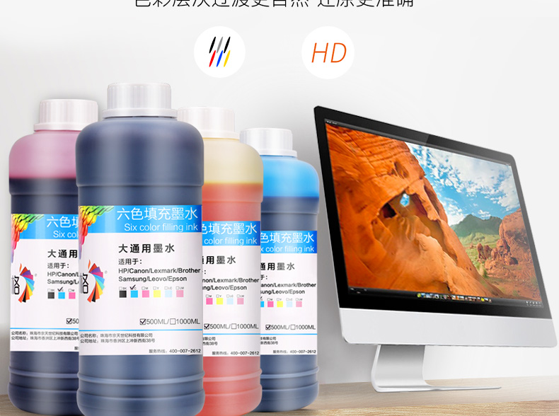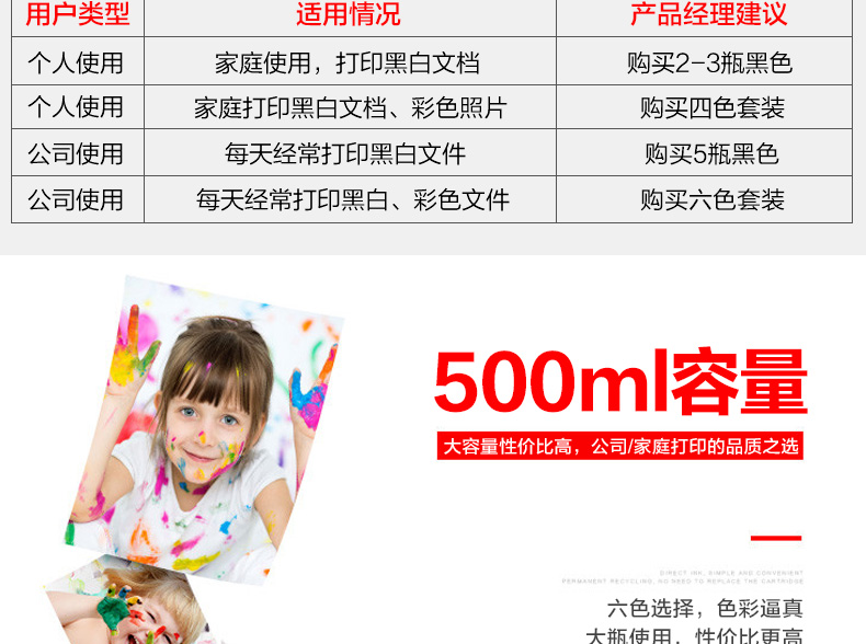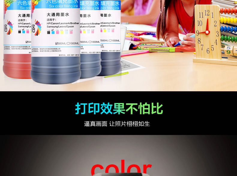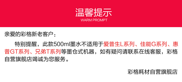 商品名称:彩格适用爱普生 惠普 佳能 喷墨打印机墨水 803墨盒墨水 500ML连供填充彩色墨盒通用墨水染料6色套装墨水
