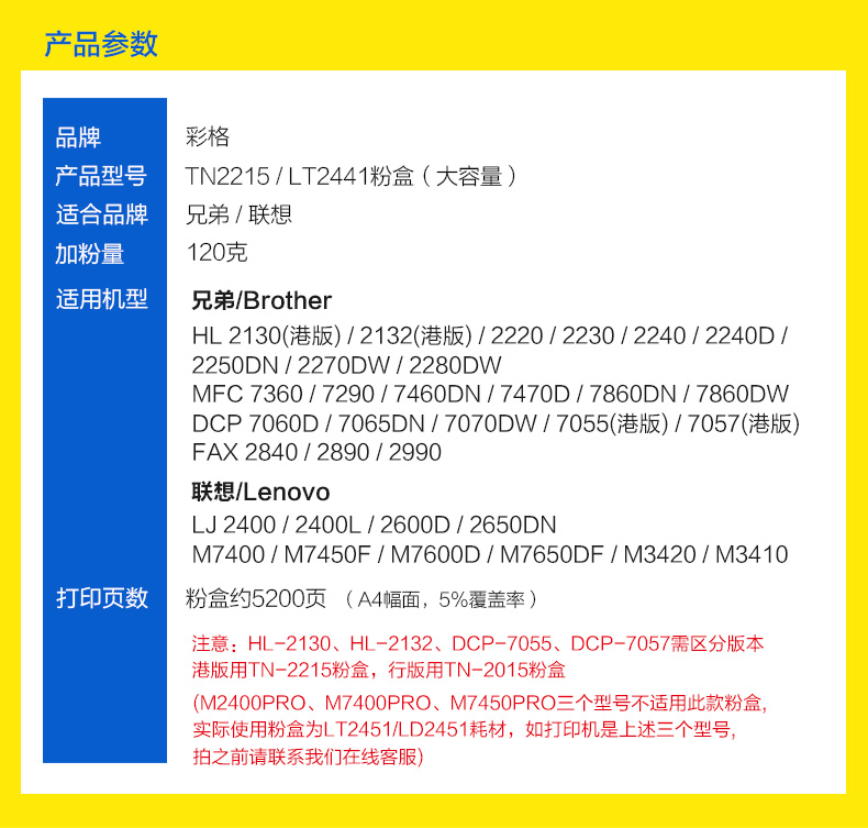 - 商品名称:彩格TN-2215大容量硒鼓墨粉盒 适用兄弟2225 HL2240D 2890 7470D DCP7060D MFC7360 2250联想M7400 M7450F
