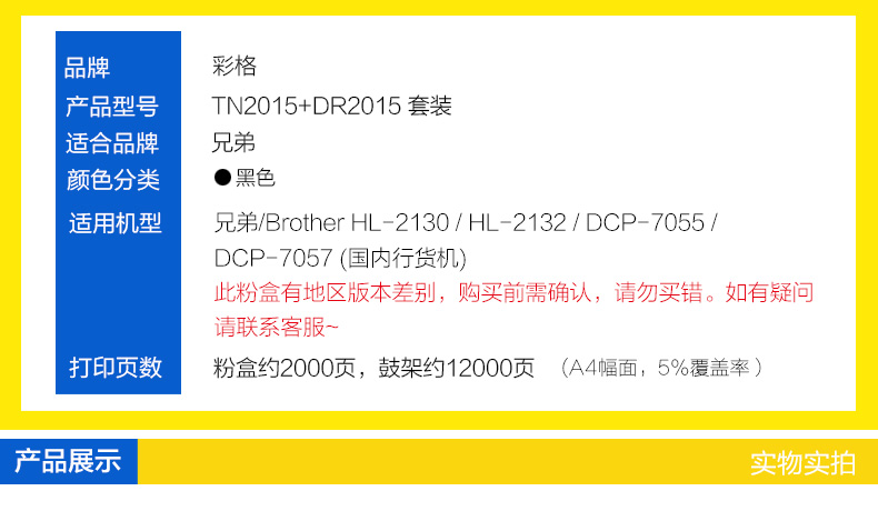 商品名称:彩格TN2015粉盒适用兄弟DCP-7055硒鼓2245墨盒HL-2130 2132 MFC7290 DR2245 兄弟7057套装