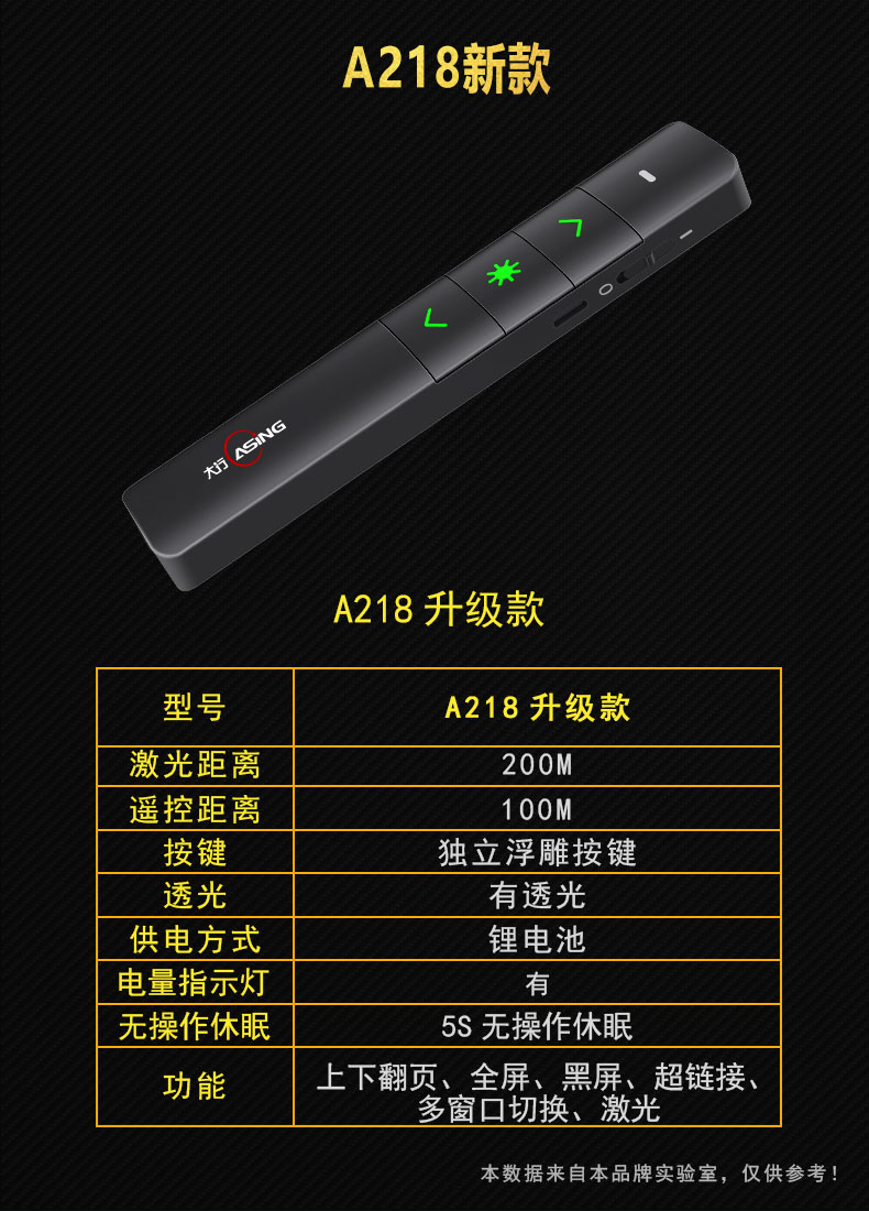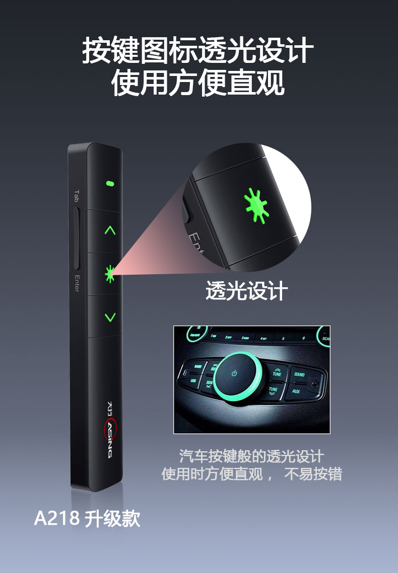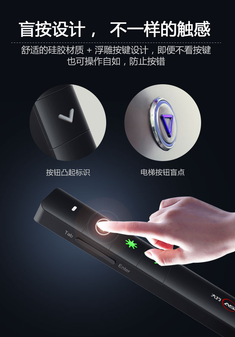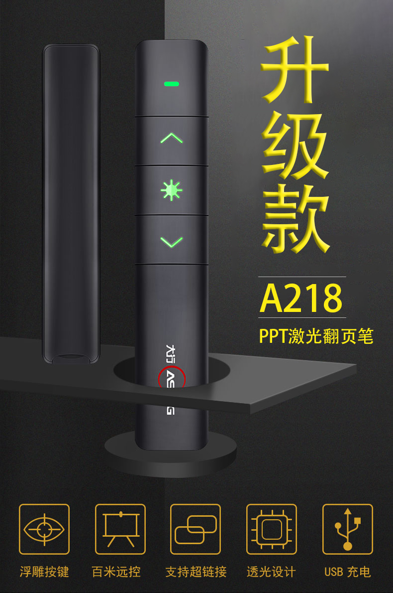- 商品名称:大行(ASiNG)A218激光翻页笔/充电式/PPT投影笔/幻灯片遥控笔/百米远控/黑色/红光