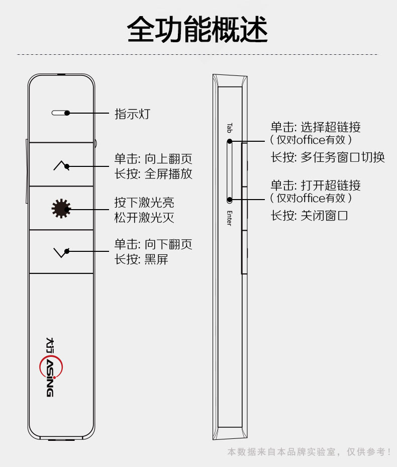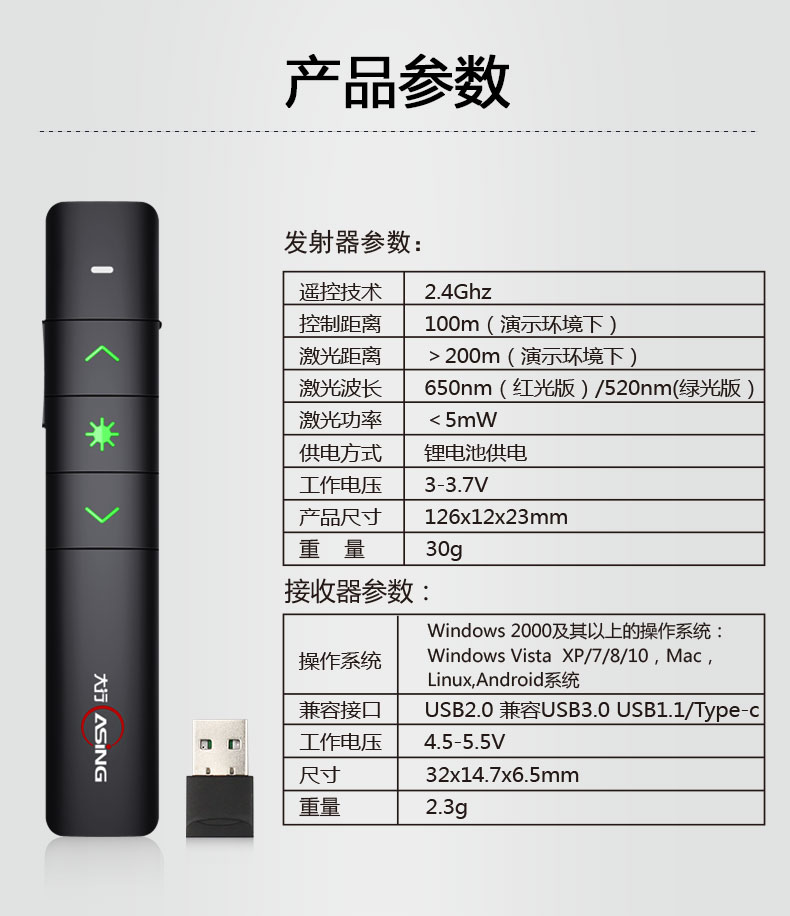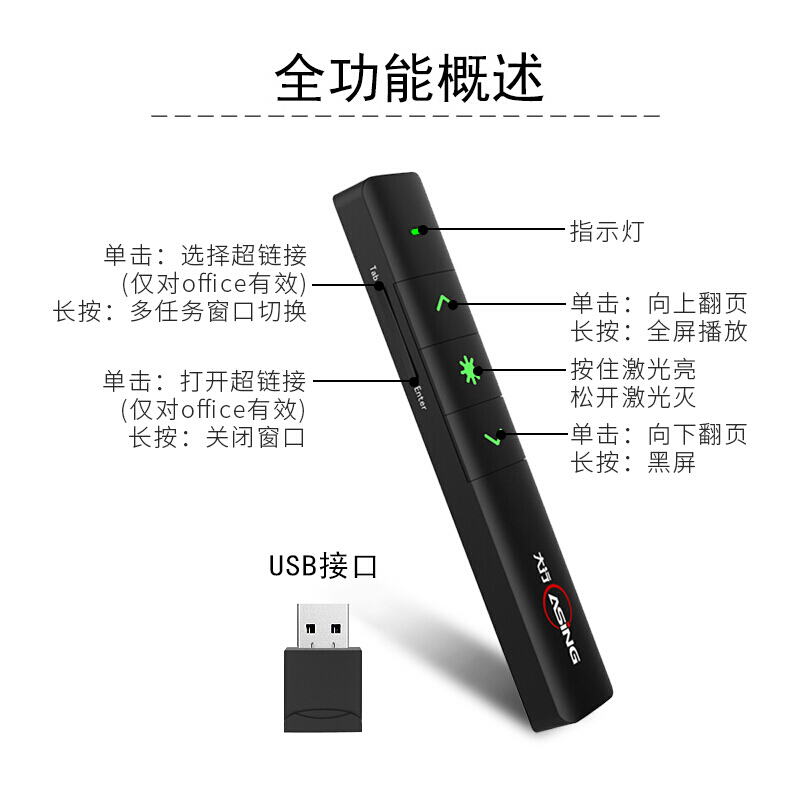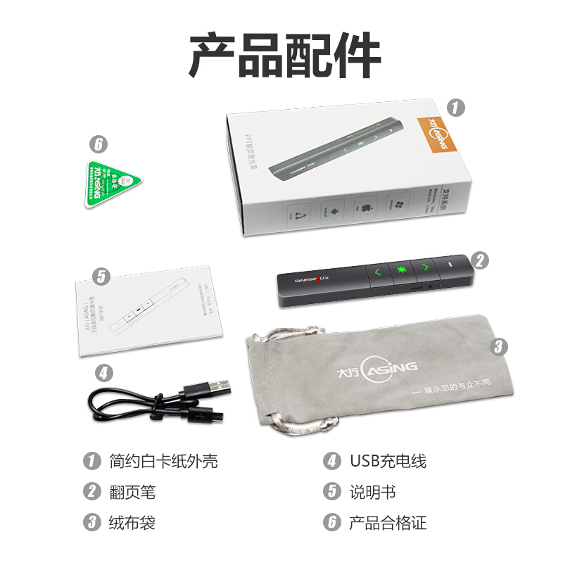 - 商品名称:大行(ASiNG)A218激光翻页笔/充电式/PPT投影笔/幻灯片遥控笔/百米远控/黑色/红光
