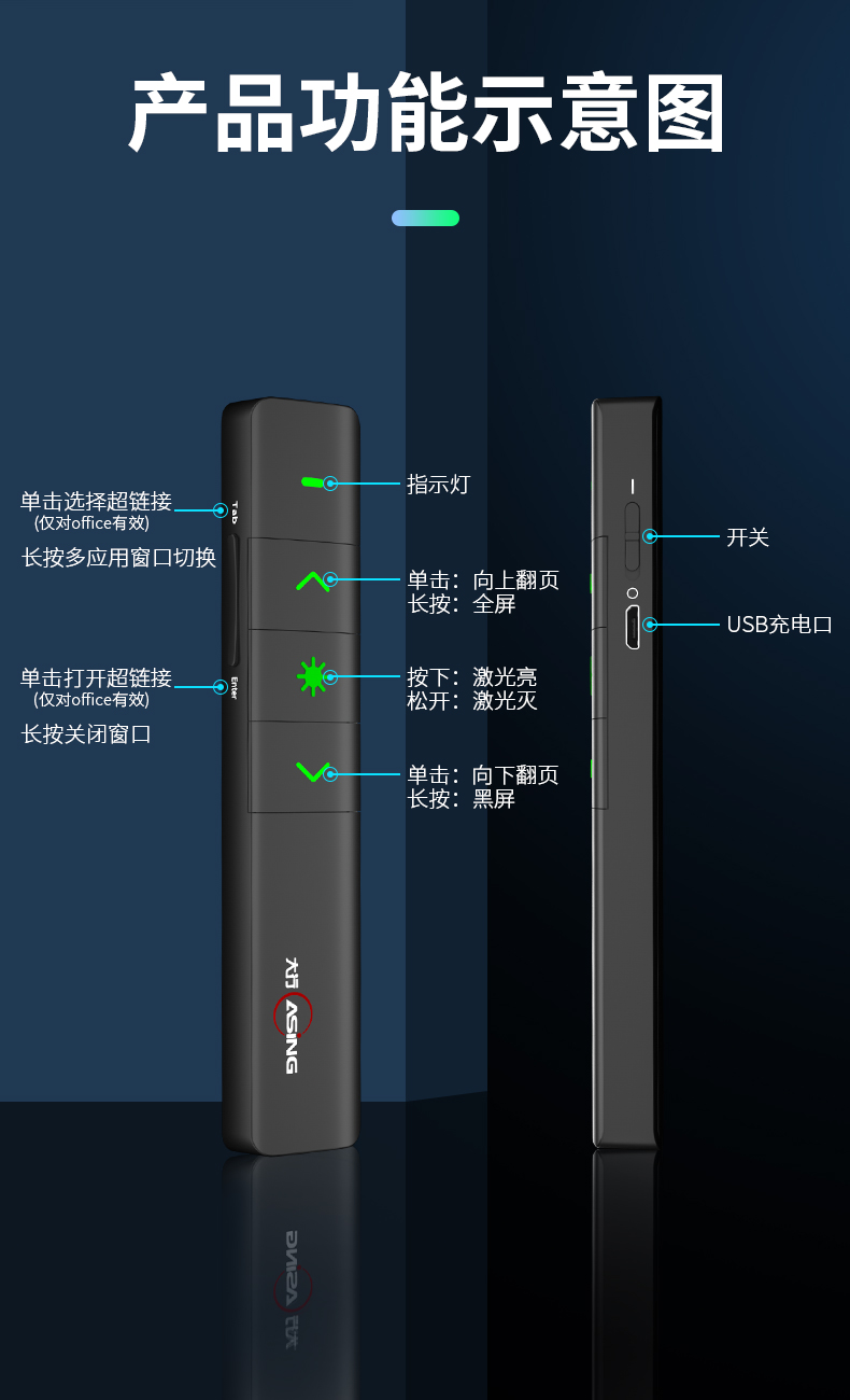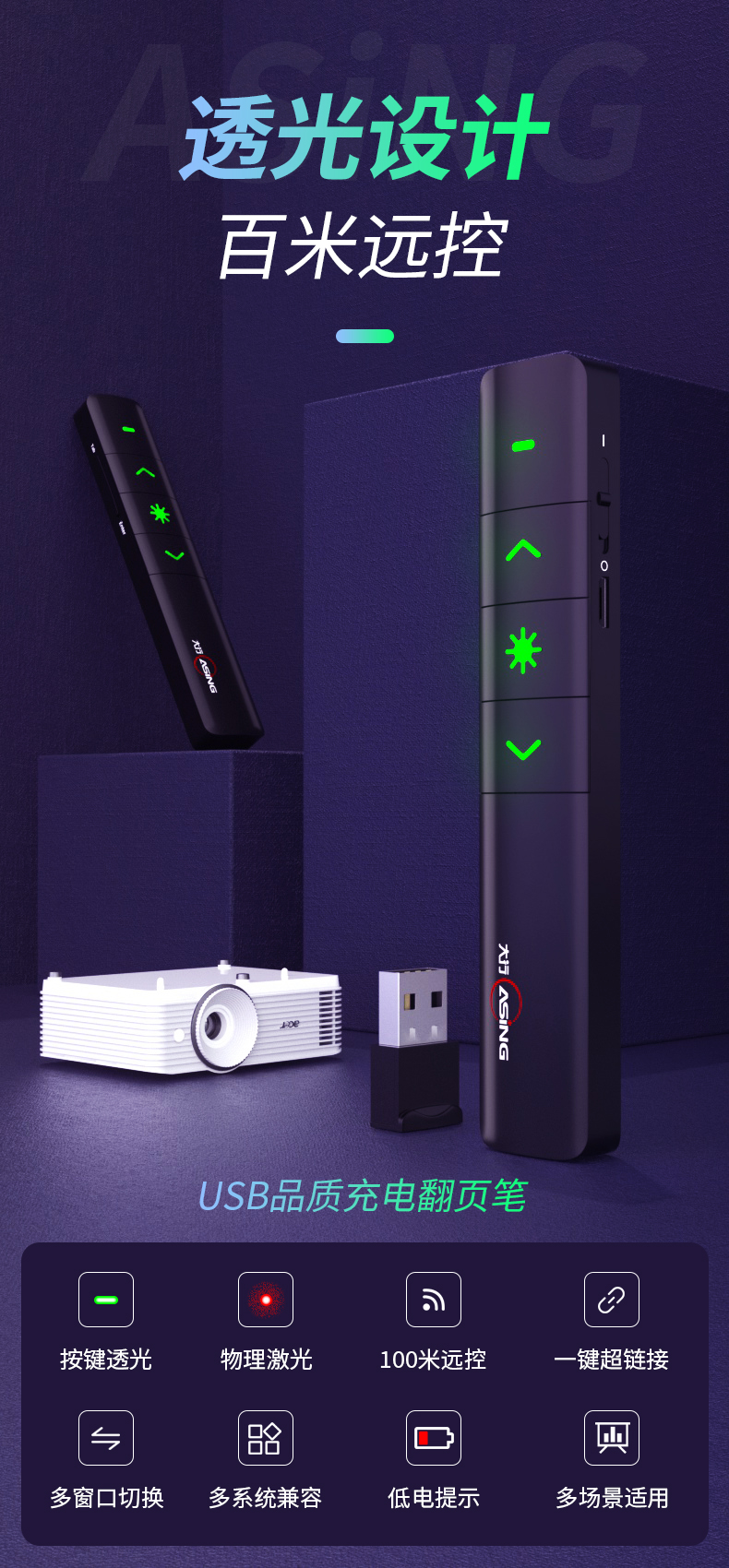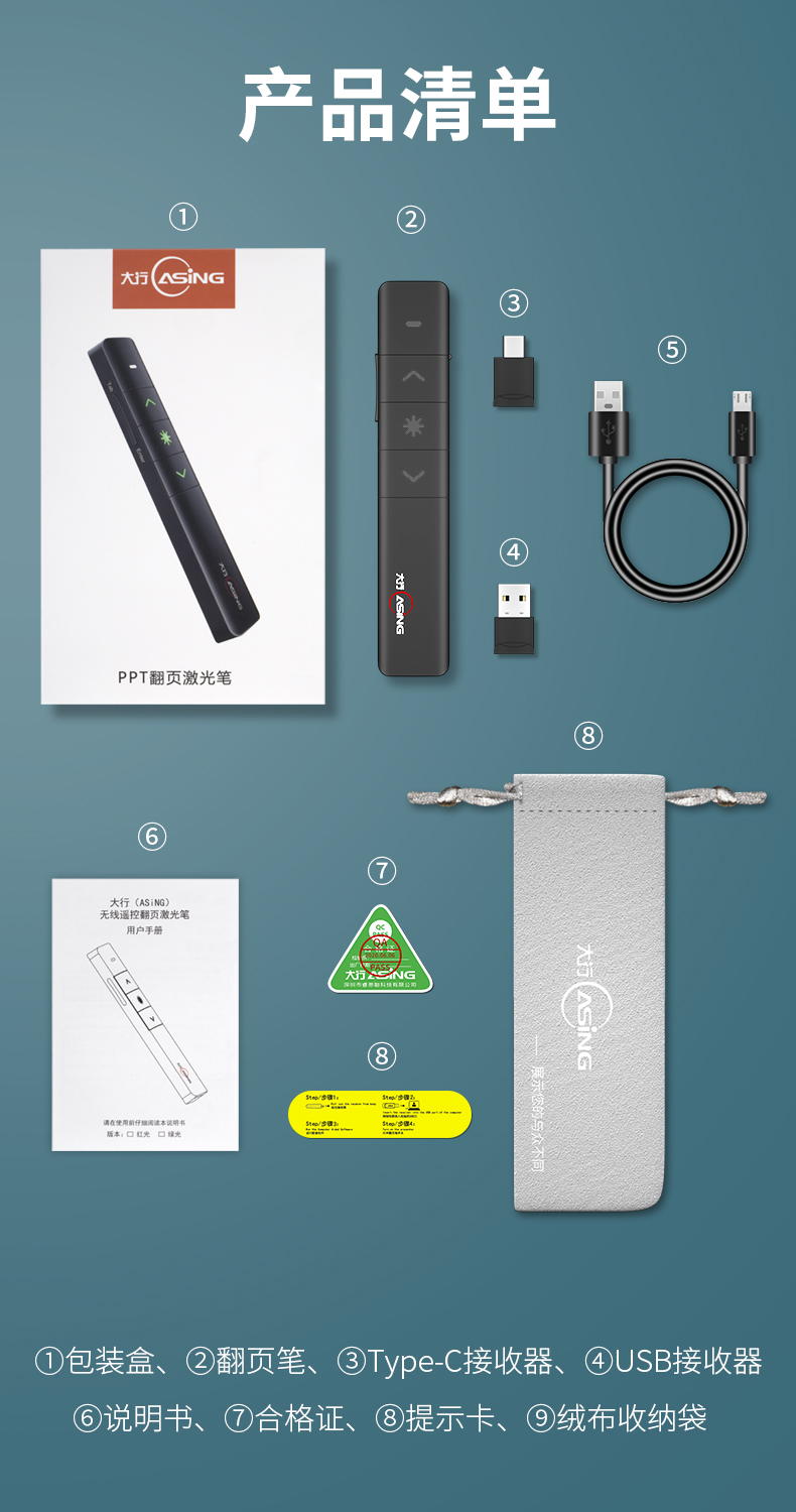 - 商品名称:大行(ASiNG)A61 360度遥控激光翻页笔 绿色透光 充电式投影笔 幻灯片遥控笔 PPT演示器Type-c USB双接口黑色