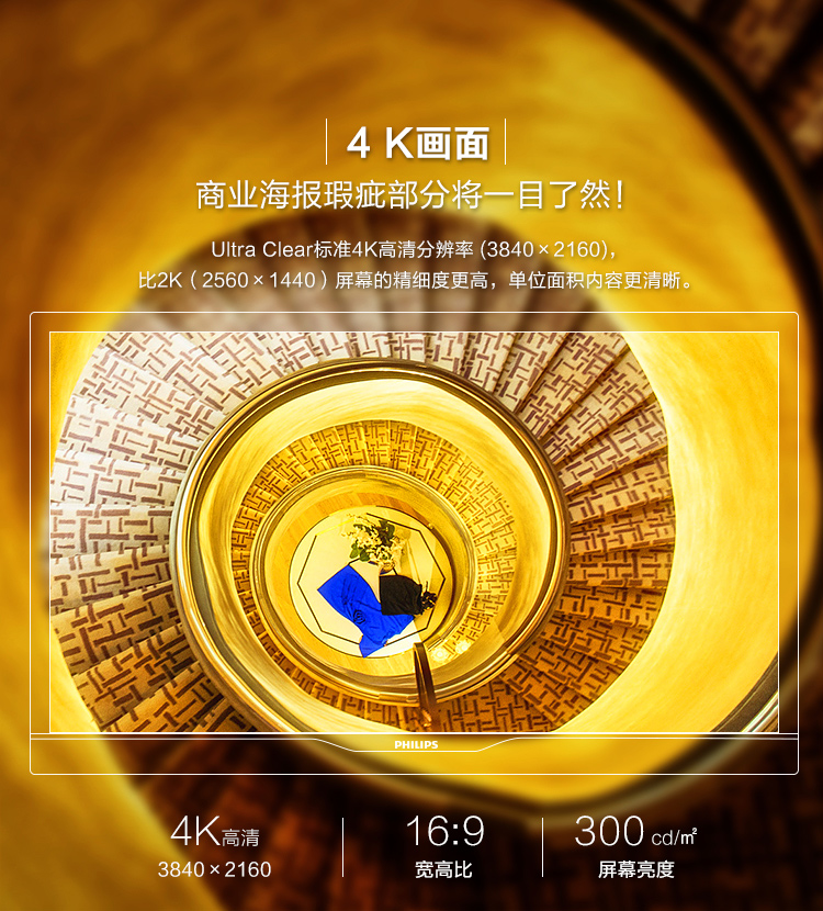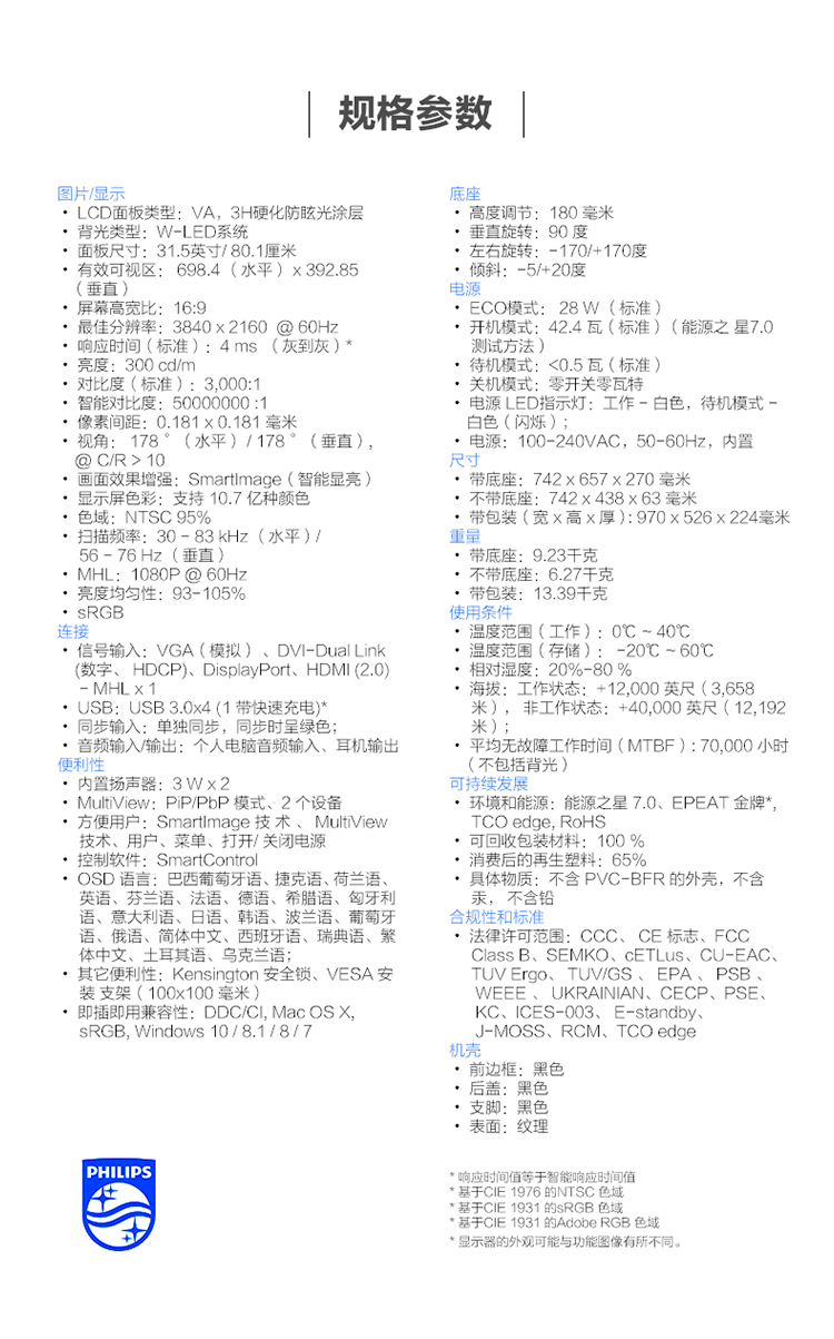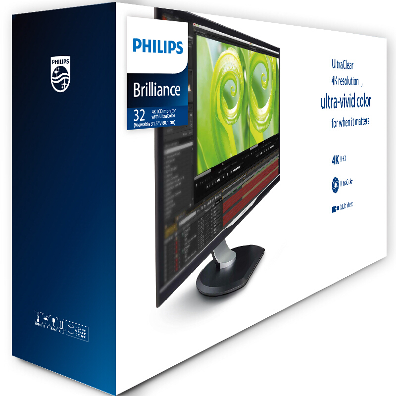 商品名称:飞利浦328P6VJEB 31.5英寸 4K/UHD 10bit色深 旋转升降底座 专业制图 内置音箱 可挂壁 电脑液晶显示器