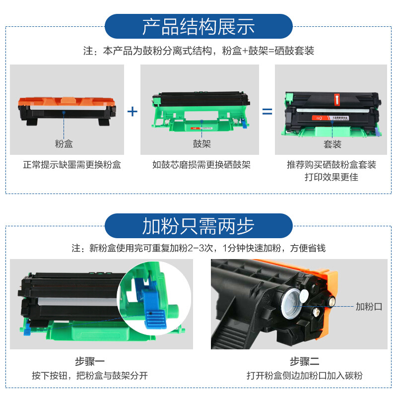 - 打印量:粉盒约1500页;硒鼓架约10000页(A4纸,5%覆盖率)
