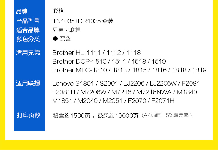 - 商品名称:彩格适用兄弟TN1035硒鼓粉盒套装HL1118 1111 1208 1218W DCP1510 1511 1518 1519 1608 1618 1619 1818 1819