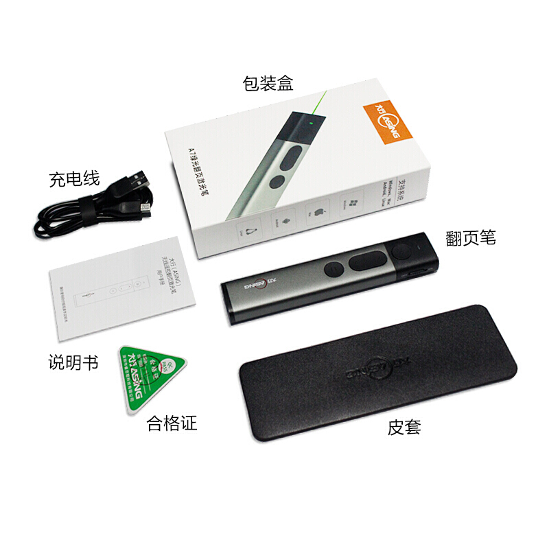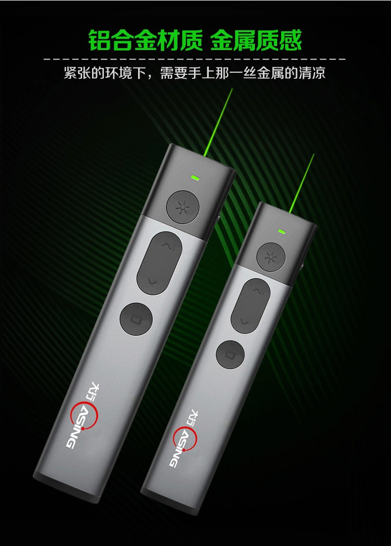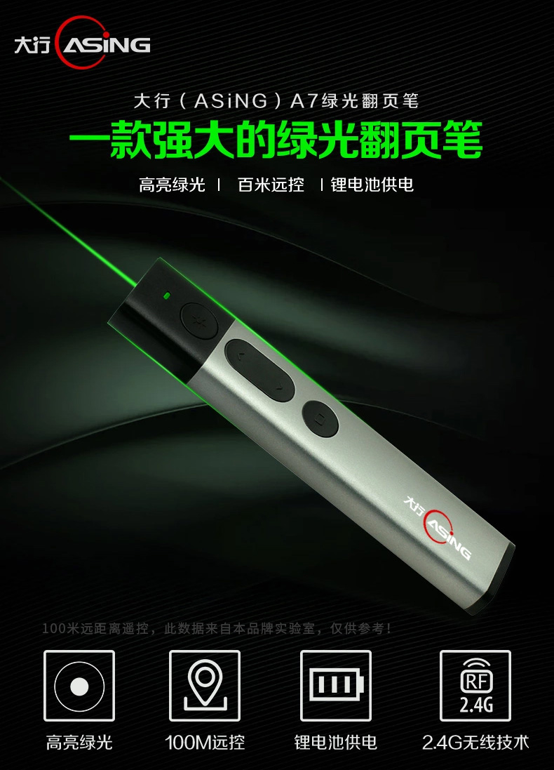 - 商品名称:大行(ASiNG) A7绿光激光翻页笔 百米远控 充电款PPT翻页器投影笔遥控笔 金属材质