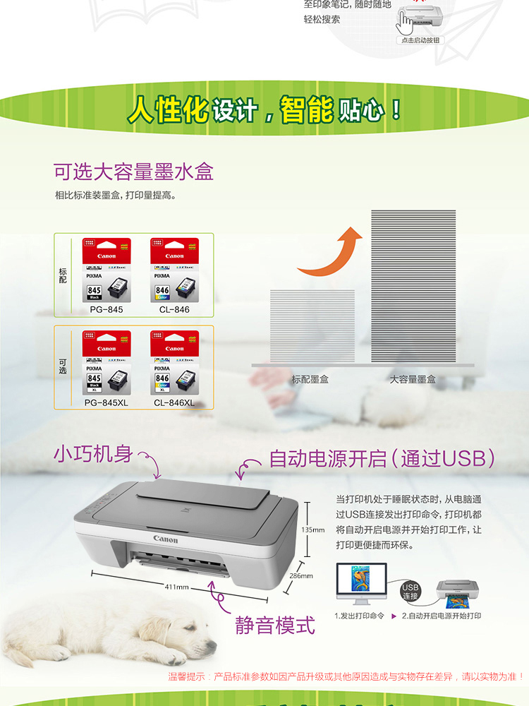 - 适用耗材型号:PG-845/CL-846(标准容量,大容量)