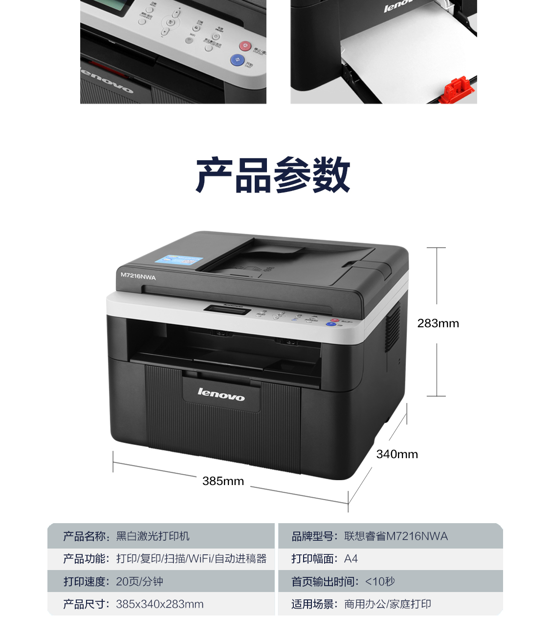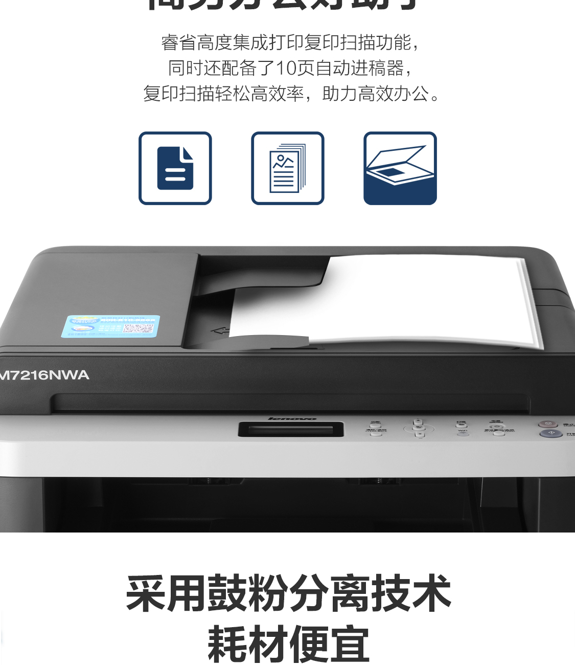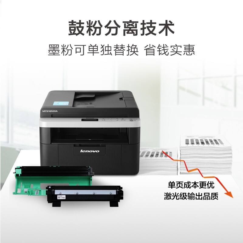 - 商品名称:联想(Lenovo)M7216NWA 黑白激光有线网络+无线WiFi打印多功能一体机 商用家用办公 (打印 复印 扫描)
