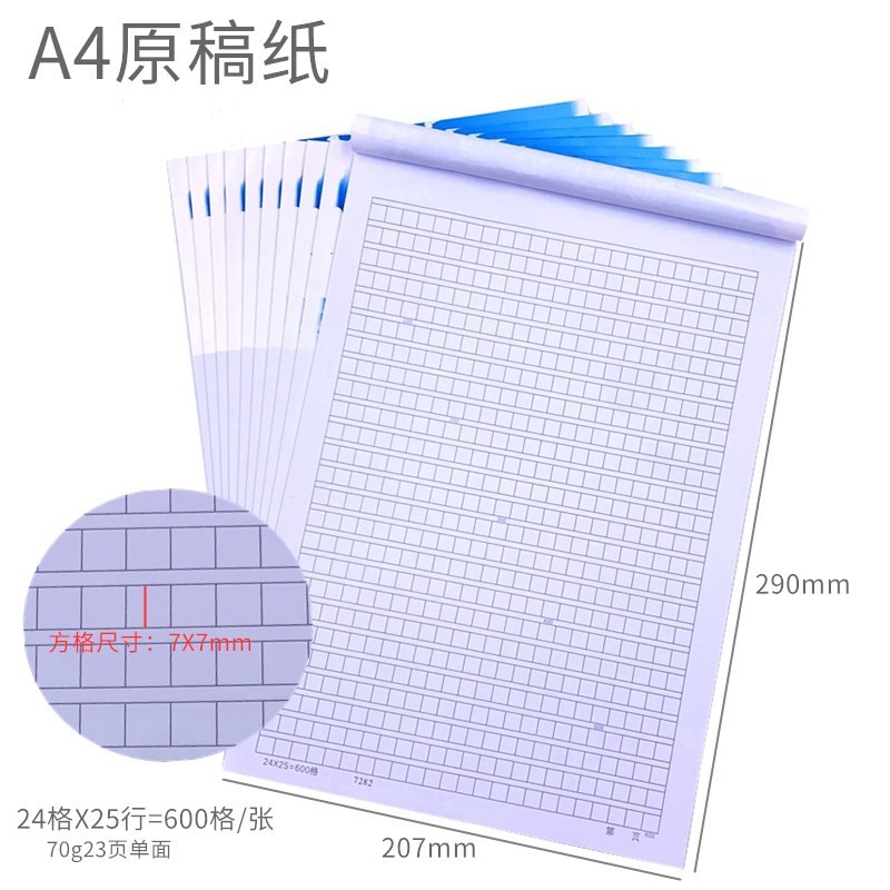 - 商品名称:绿文A4信纸稿纸作文纸学生原稿纸学生用考试用600格a4方格纸作业纸信签纸信稿本大学生厚文稿格子纸张 A4207X290MM 600格原稿纸10本装