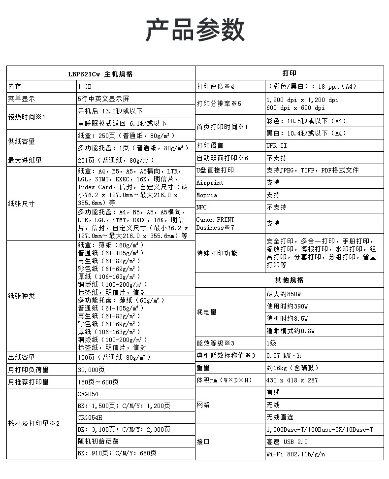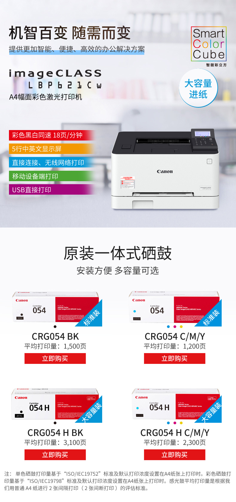 商品名称:佳能(Canon) LBP621Cw 智能彩立方 A4幅面彩色激光打印机 无线连接