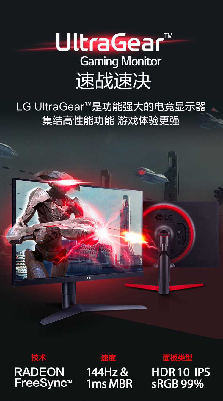 LG 27GL650F 27英寸 144Hz IPS硬屏 1ms响应 HDRFreeSync 三面微边 旋转升降底座 电竞显示器