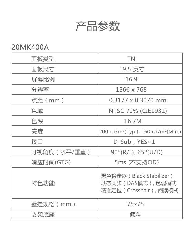 - 商品名称:LG 20MK400A-B 19.5英寸 阅读模式 低闪屏 色弱模式 屏幕控制 可壁挂 家用办公 显示器