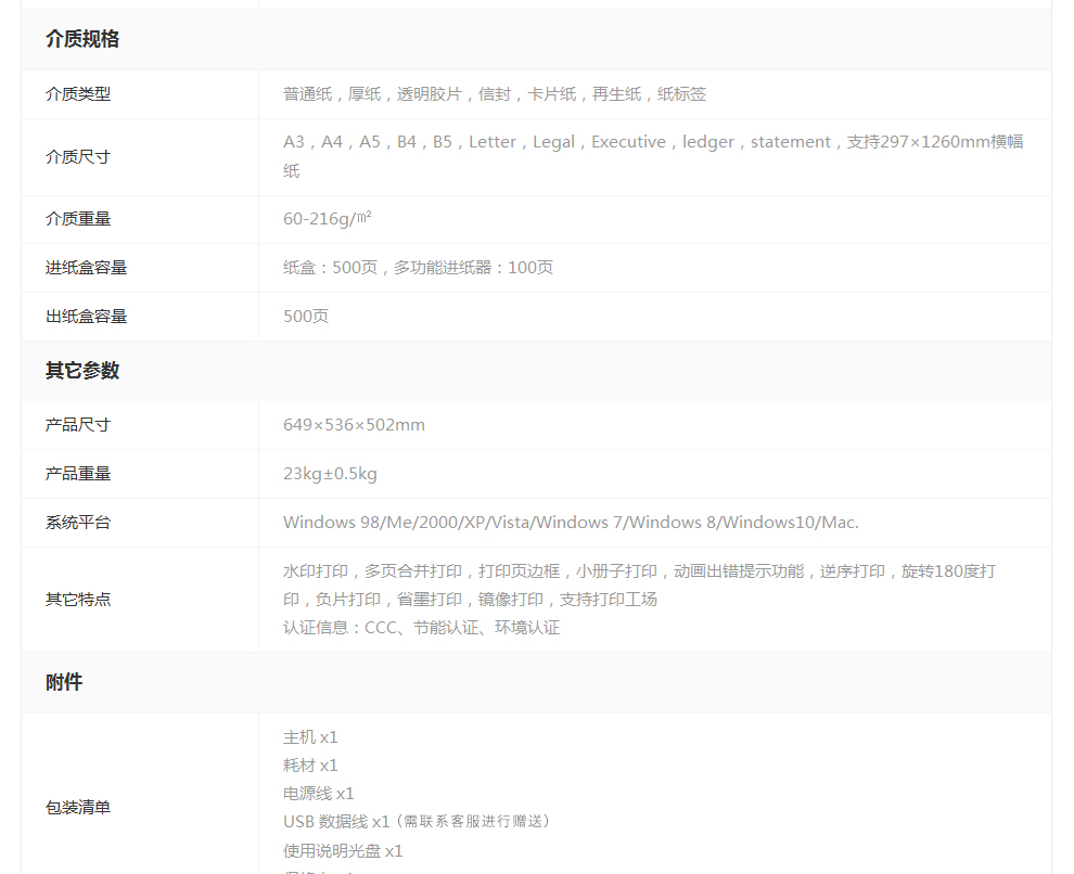 - 纸张输入容量:纸盒:500页,多功能进纸器:100页