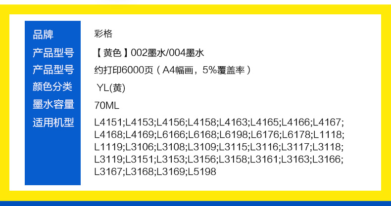 - 商品名称:彩格适用爱普生002黄色墨水 004打印机墨水 L4153 L4156 L4165 L4167 L4169 L1119 L3151 L3166 L3106 L3115