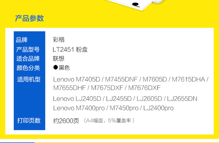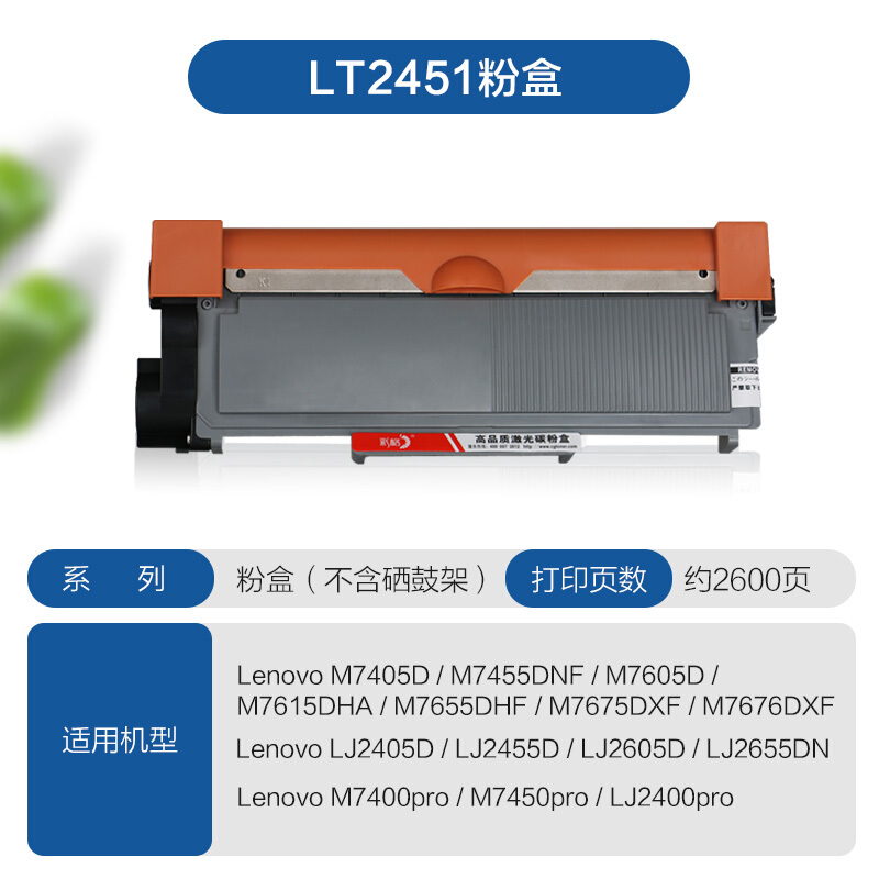 - 商品名称:彩格LT2451h粉盒 适用联想LJ2405D LJ2455D LJ2605D LJ2655DN M7605D M7615DNA M7455DNF M7655DHF M7675DXF